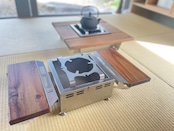 内容物:IRO+RI本体、付属脚×4、五徳、灰900g、サイドテーブル(木製板)×2、サイドテーブル置き台(アルミ製組み板)×2式、サイドテーブル収納袋、取扱説明書