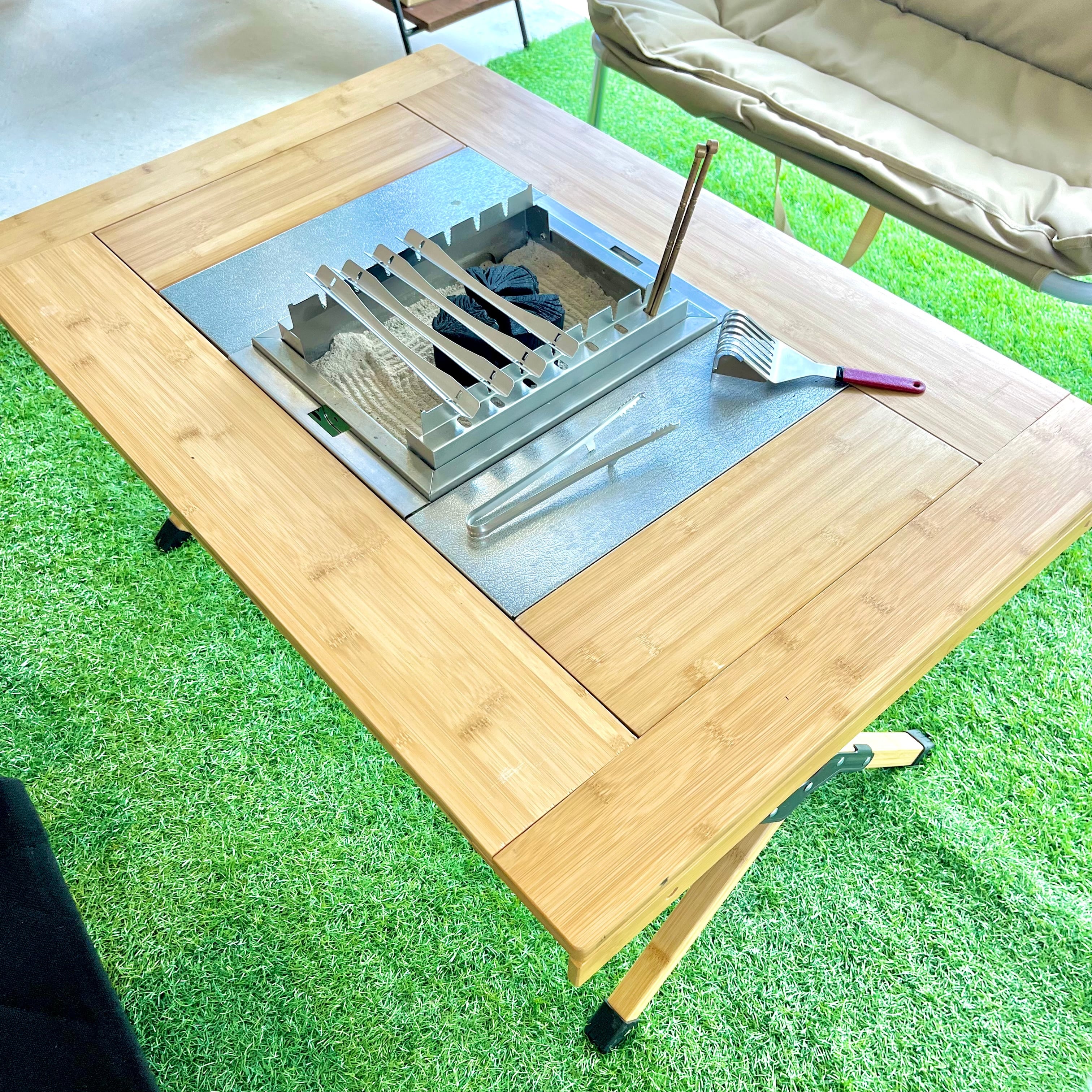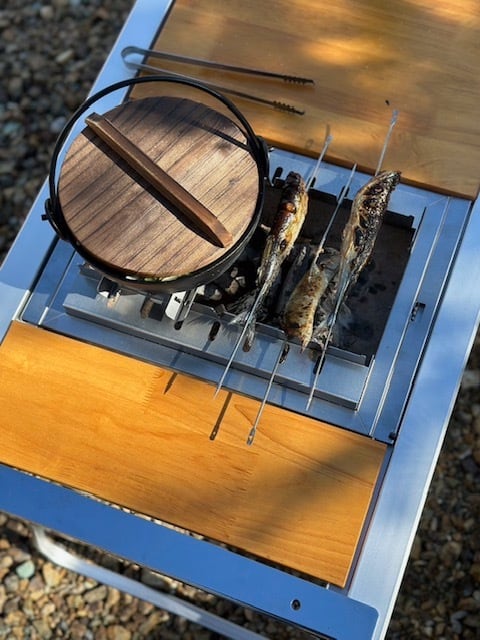 IGTテーブルへ装着しアウトドアで炭火調理を。炭の遠赤外線で焼く食材は、うま味がギュッと閉じ込められてひと味違った味わいになるのではないでしょうか。